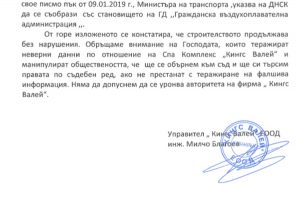 И така строителството продължава ,без нарушения .Днес със становище , излязоха и от фирмата – инвеститор.В него те обръщат внимание на всички , които тиражират неверни данни по отношение на Спа Комплекс „Кингс Валей“ и манипулират обществеността, че ще се обърнат към съд и ще си търсят правата по съдебен ред, ако не престанат с тиражиране на фалшива информация. ,,Няма да допуснем да се уронва авторитета на фирма „ Кингс Валей“.,,- се казва в становището.