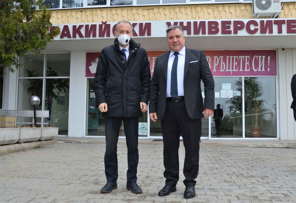 Ректорът на Тракийски университет доц. д-р Добри Ярков и министърът на образованието и науката Красимир Вълчев подписаха споразумение по Национална научна програма „Интелигентно животновъдство“ – ИНТЕ-ЖИВО, финансирана от Министерството на образованието и науката в Заседателната зала на Ректората.