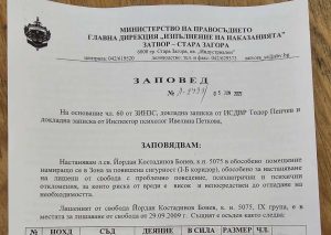 В заповедта за настаняване на Йордан Костадинов Бонев в изолатора, издадена от началника на затвора в Стара Загора, се посочват редица основания, свързани с неговото поведение, здравословно състояние и рисков профил. Документът е издаден на 5 юни 2025 г. и се позовава на чл. 60 от Закона за изпълнение на наказанията и задържането под стража